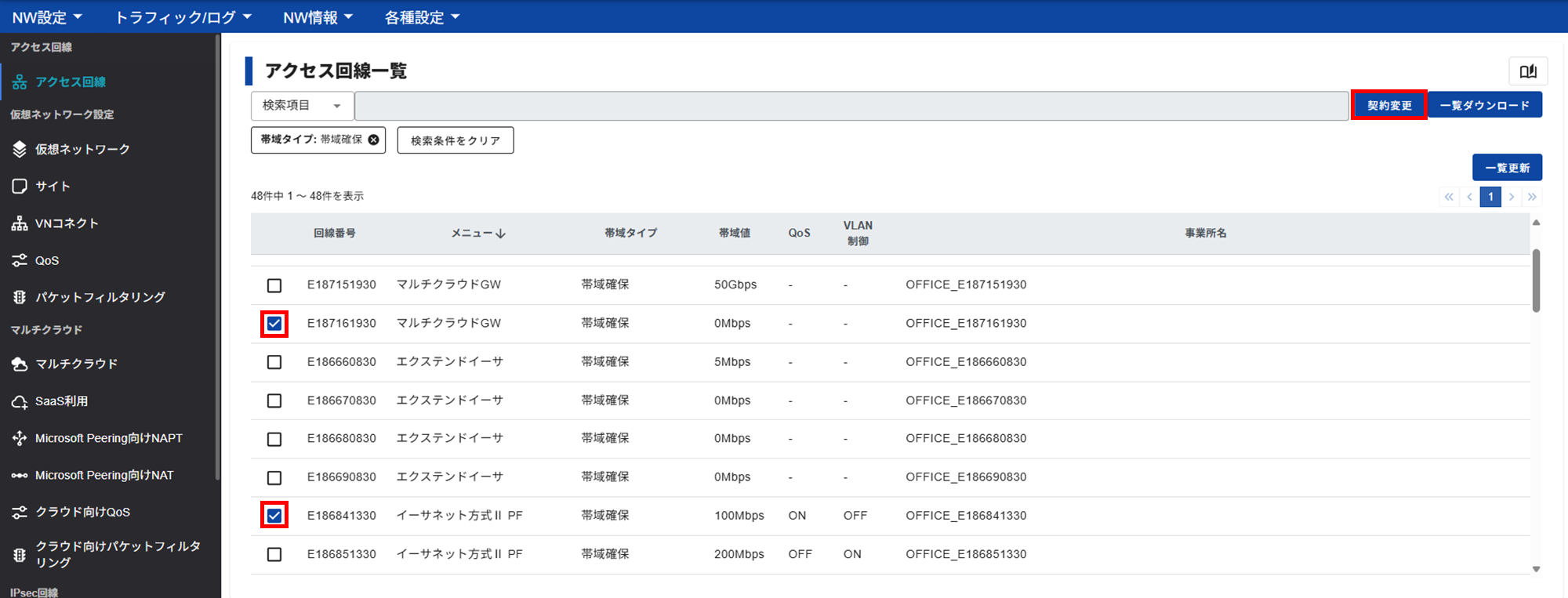 ・「アクセス回線一覧」画面では契約申込/変更申込を行う事ができます。契約の対象となる行のチェックボックスをチェック後、「契約変更」ボタンを押下します。