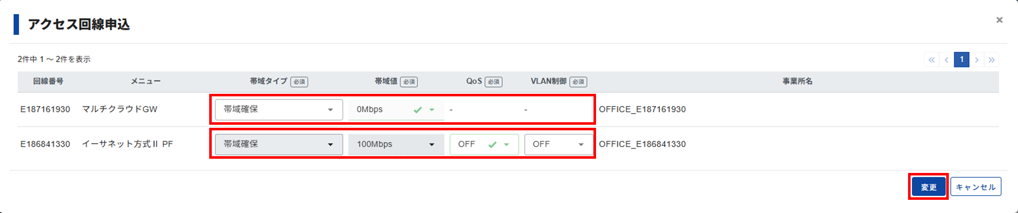 ※帯域値、QoS設定、VLAN制御を変更した場合はご請求額が変更となります。設定を変更する際にはお気をつけ下さい。