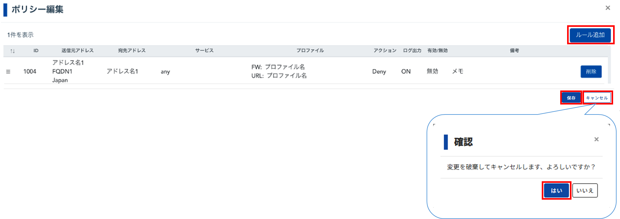 ポリシーに変更を加え、未保存のまま「×」「キャンセル」ボタンを押下した場合、「確認」画面が表示されます。