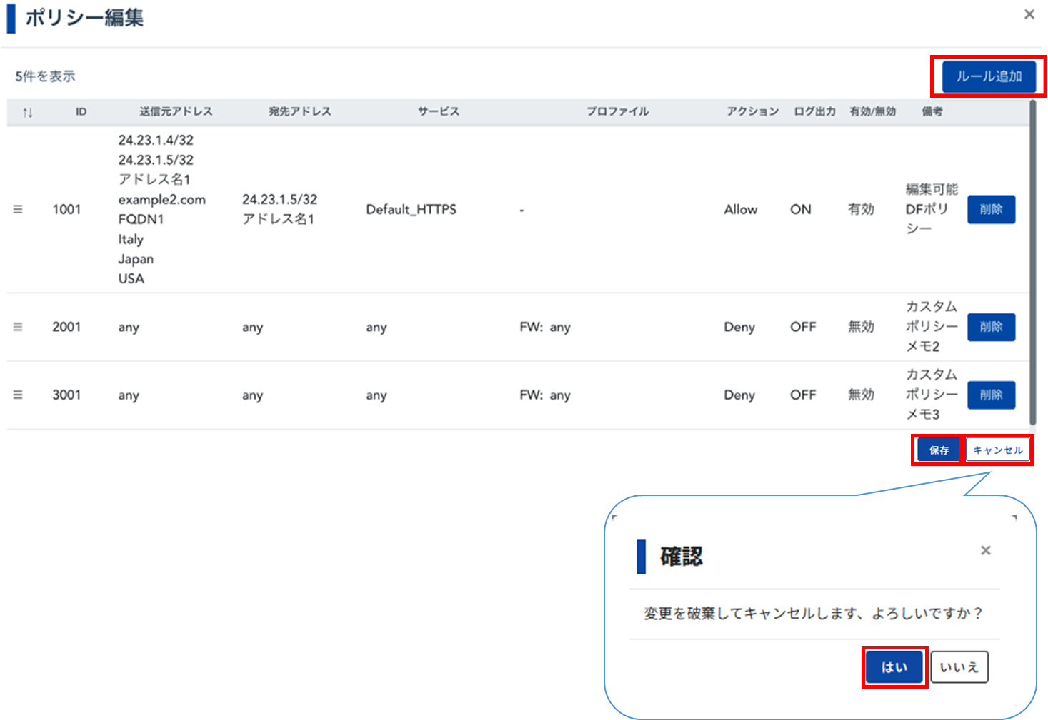 ポリシーに変更を加え、未保存のまま「×」「キャンセル」ボタンを押下した場合、「確認」画面が表示されます。