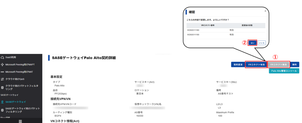 「有効」ボタン押下後、「確認」画面にて「はい」押下することでVNコネクト状態が「有効」となり、トラフィックの転送が開始されます。(反映完了まで最短で数分間必要になります。)