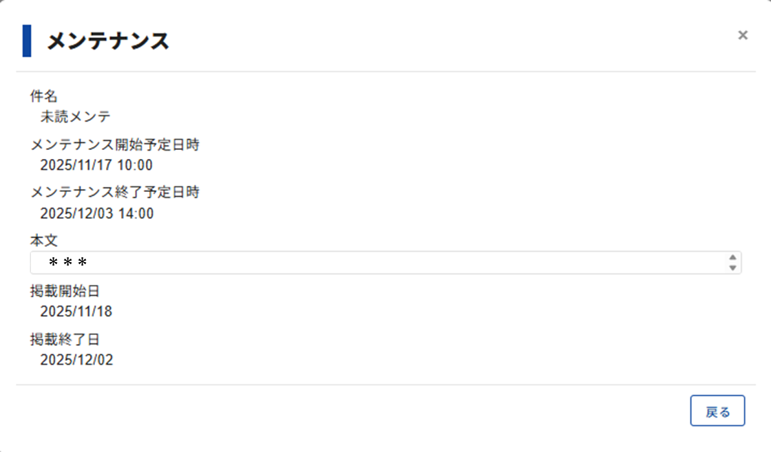※障害発生直後は障害発生日時:調査中 と表示され、調査後には障害発生日時と障害復旧日時:(日時)見込み で表示されます