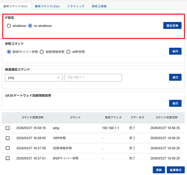 画面上へ、現在の状態が表示されるため、実行する操作(「shutdown」「no shutdown」)を選択し「設定反映」ボタンを押下することで変更が可能です。